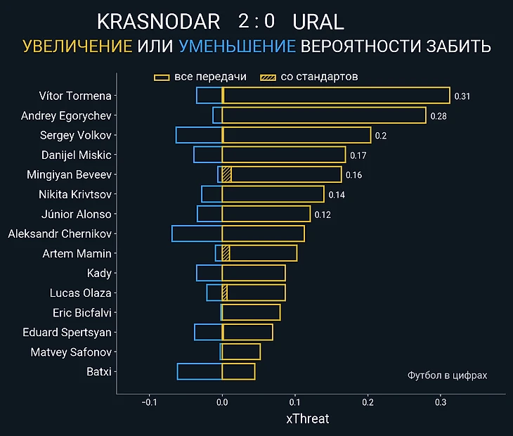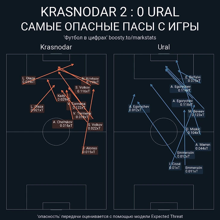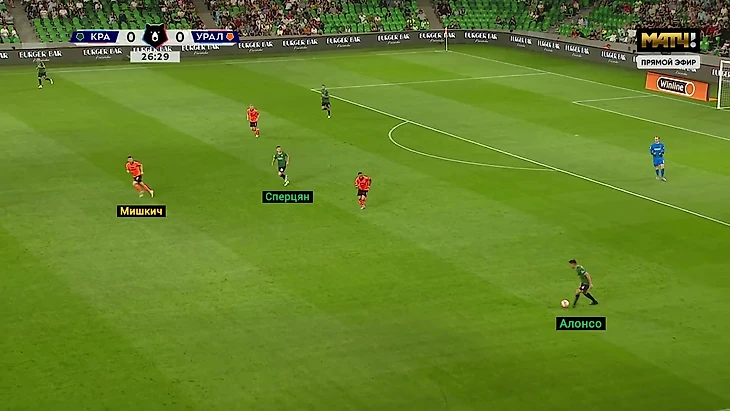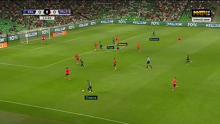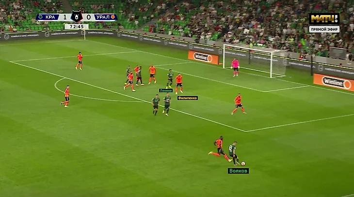 Такие длинные передачи были достаточно эффективны. «Краснодар» в принципе начал активно использовать забросы от защитников в этом сезоне. А против «Урала» ещё и удавалось насыщать правый фланг, где активно подключался Волков.