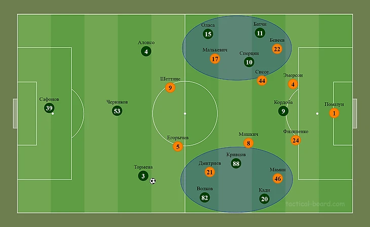 В случаях, когда Ишков и Дмитриев поднимались выше, Черников уходил правее, а слева опускался Оласа и хозяева создавали ситуацию 4 против 3 в первой линии.