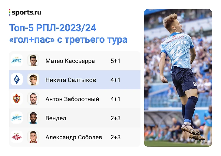 С третьего тура РПЛ по «гол+пас» Салтыков уступает только Матео Кассьерре.