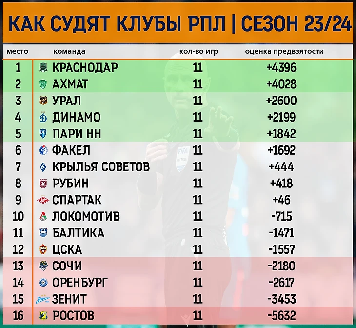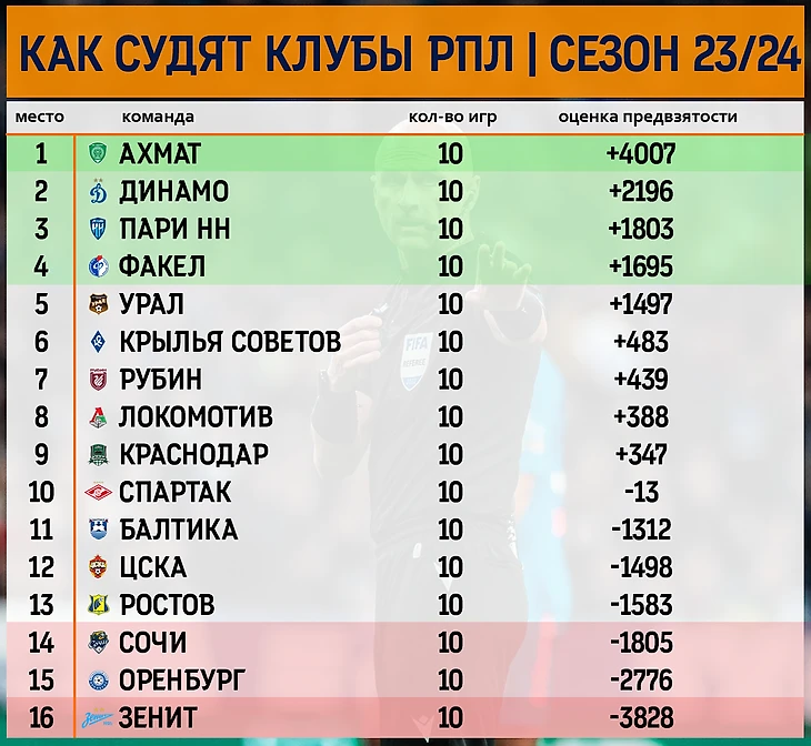 Таким образом, количество баллов у «Сочи» и «Факела» поменялось, хоть и не так сильно, учитывая спорность эпизода. А таблица предвзятости судейства по итогам десяти туров стала выглядеть так: