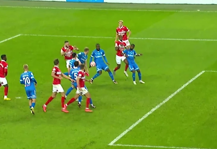 Линейный судья зафиксировал офсайд у Даку, который как минимум был не очень большим: во «вне игры» оказался корпус нападающего, он действительно был сильно наклонен вперед, но ракурс боковой камеры оказался настолько неудачным, что повтор вообще не позволяет оценивать момент. Боковая камера расположена слишком далеко от эпизода, а центральная не успела поймать момент, в итоге у нас была лишь такая картинка:
