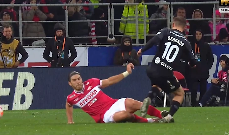 Второй эпизод сложнее: Бабичу дали неудачный пас, из-за чего защитнику «Спартака» пришлось в подкате выбить снаряд из-под набегавшего Облякова. Он это сделал, но далее попал шипами на большой скорости в незащищенную область голеностопа соперника.