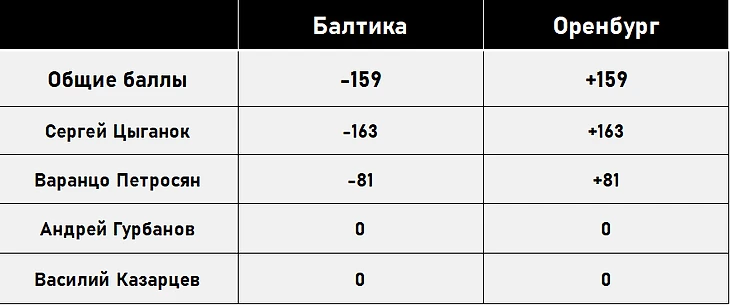 Тут я согласен с «шефом», Казарцев во второй раз с вмешательством переборщил, но в любом случае эпизод пограничный и баллы за него начислились в пользу «Оренбурга», из-за чего складывающийся положительный баланс для «Балтики» в один момент перевернулся вверх ногами. Впрочем, предвзятости в этой игре не было.