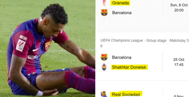 Это означает, что Рафинья может пропустить как минимум четыре игры, включая матчи против «Порту» (Лига чемпионов), «Гранады» (Ла Лига), «Бильбао» (Ла Лига) и «Шахтера» (Лига чемпионов).