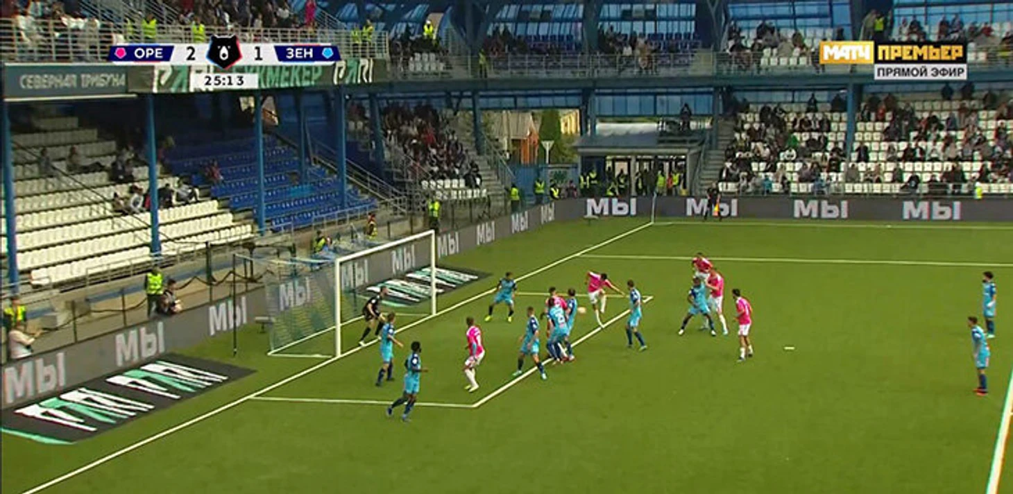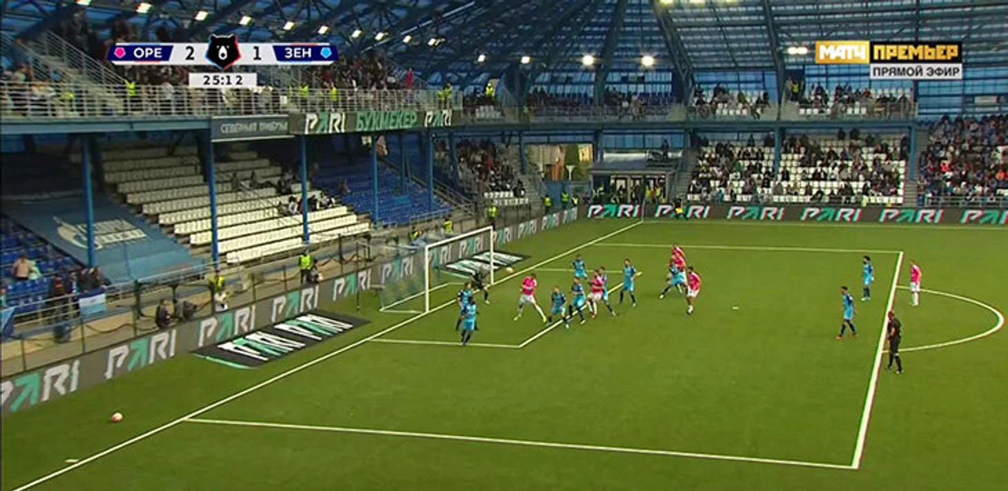 Но после этого уже в первом тайме «Оренбург» ответил тремя мячами: отличились Дмитрий Воробьев, Матиас Перес и Брайан Мансилья. Первый гол – навес с фланга.