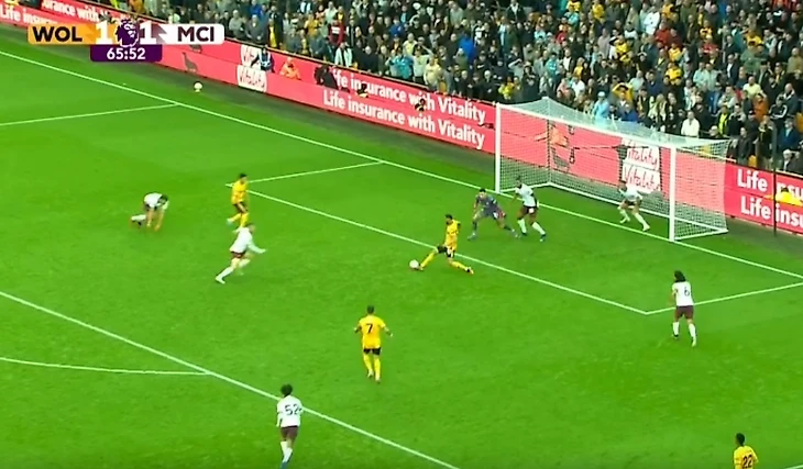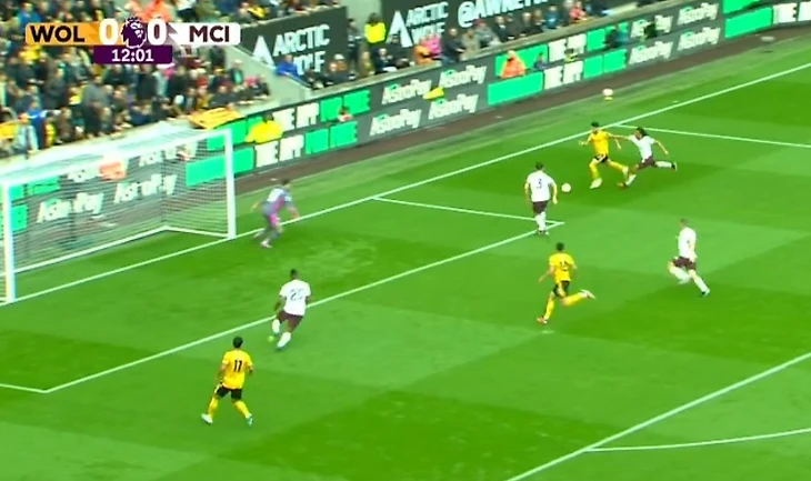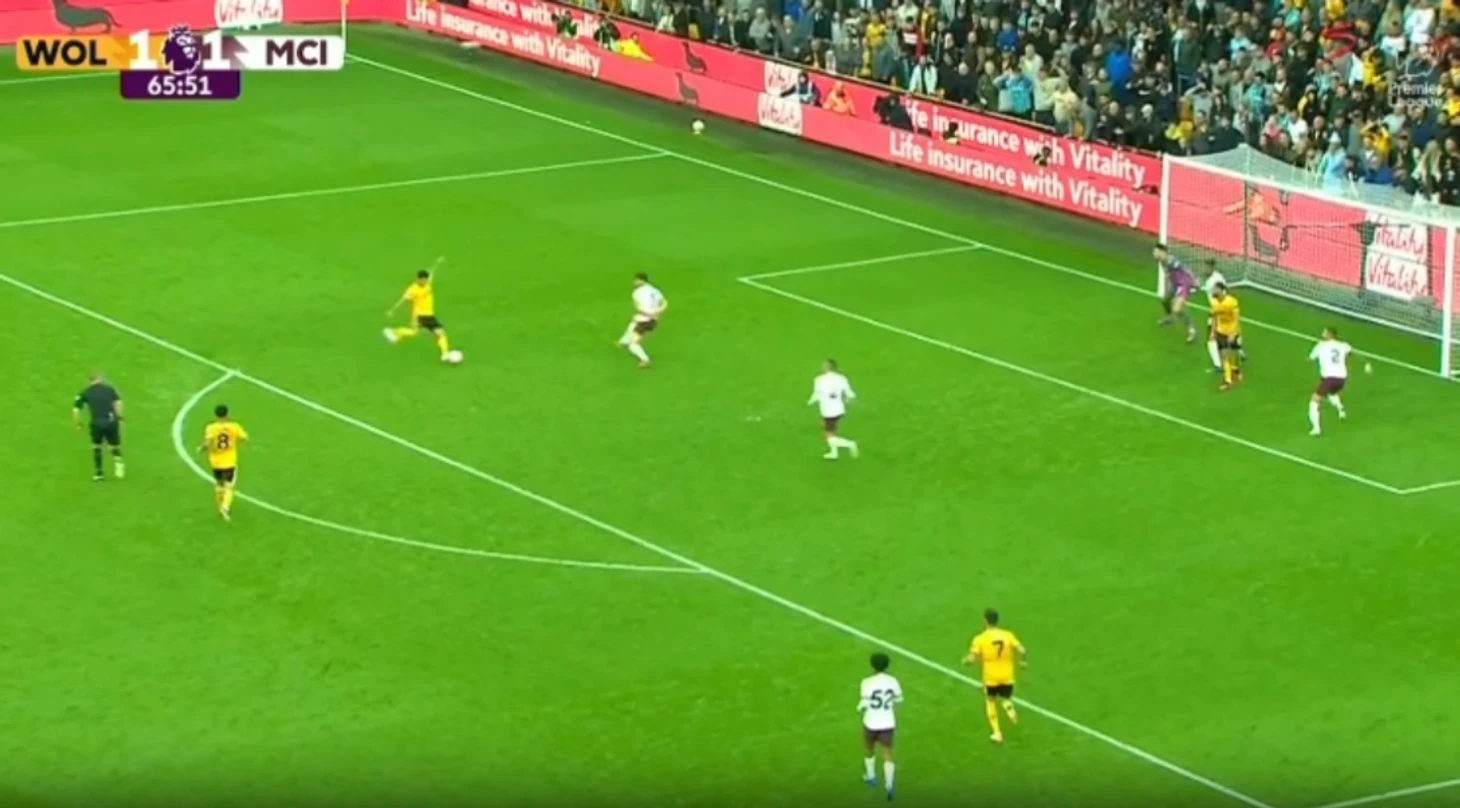 На 13-й минуте «Вулверхэмптон» повел: на чужой половине Ковачич зарядил мячом в Фодена, Педру Нету подхватил, унесся от Фодена, а затем и от Натана Аке – прострел обернулся автоголом Диаша. Вот где Нету забрал мяч – за десяток метров до центральной линии.