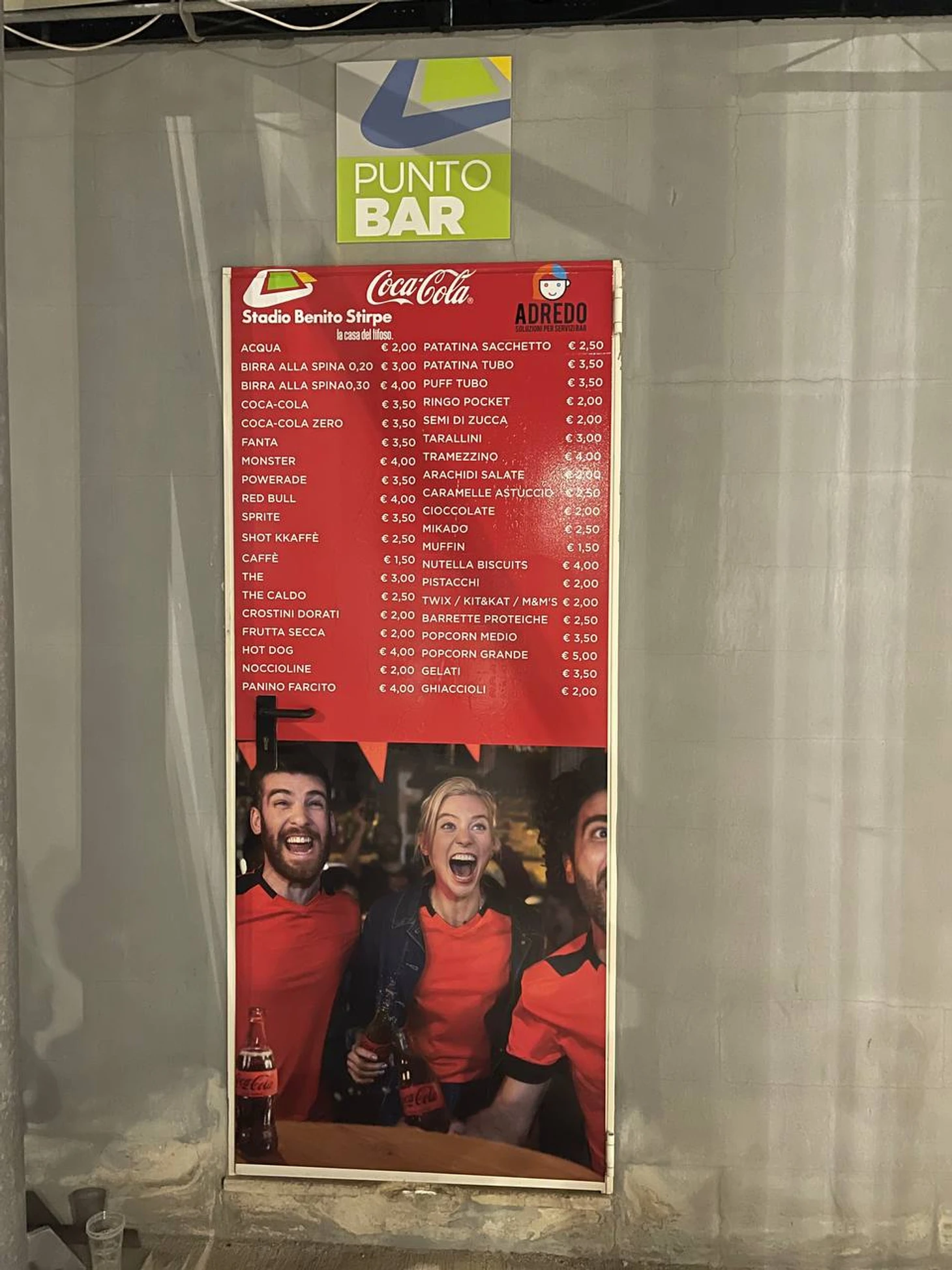 Атмосфера на самом стадионе и вокруг него скорее напоминает Серию Б, но это даже плюс. Всё очень уютно и по-домашнему. Вместимость «Бенито Стирпе» 16 тысяч человек, а в самом городе живёт немногим больше 40 тысяч – на матче буквально была треть горожан. Все пьют пиво, едят панини, общаются. Полицейские (которых на подходе к стадиону я насчитал всего четыре) здороваются с проходящими мимо болельщиками. Стюард на входе решил создать видимость досмотра и сказал мне, что нельзя зайти с павербанком. Я сделал вид, что ничего не понял на итальянском, он махнул рукой, положил павербанк обратно в рюкзак и спокойно пропустил меня.