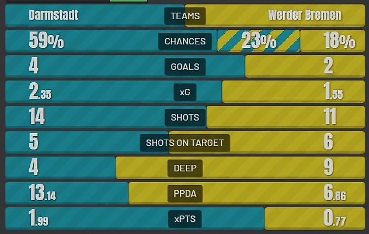 «Дармштадт» наконец-то прервал серию поражений, которая длилась пять матчей. Получилось очень эффектно. Хозяева вышли вперед уже на 4-й минуте, а к 60-й и вовсе громили бременцев– 4:0.