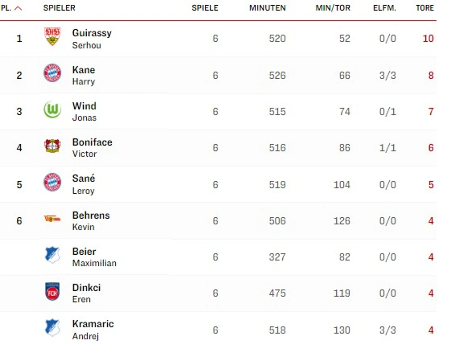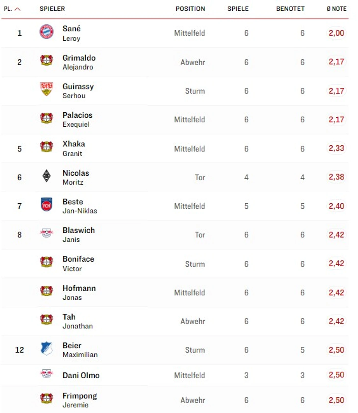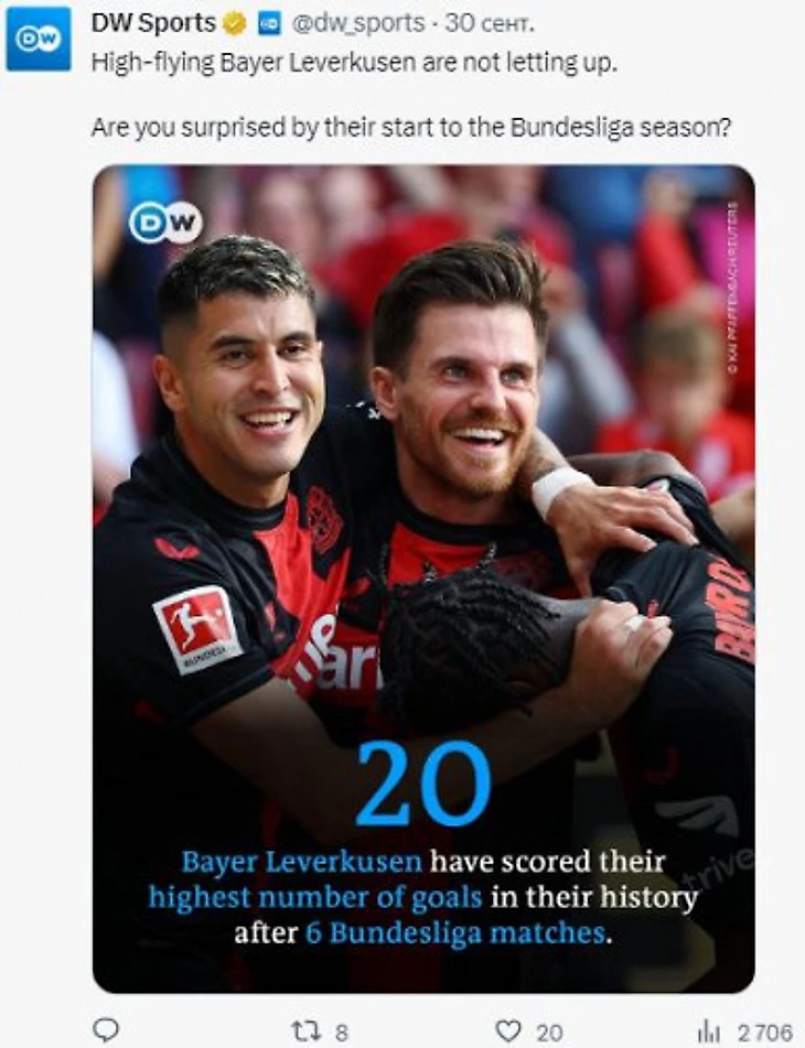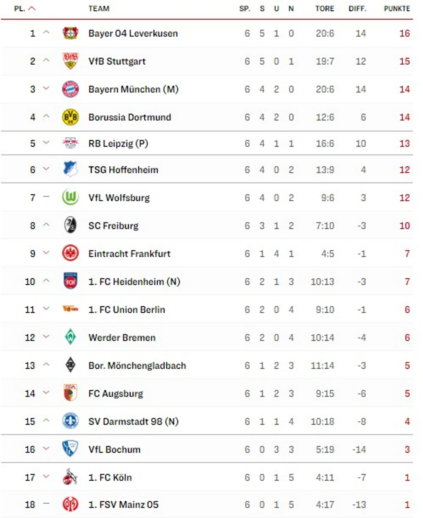 - «Байер» набрал 16 очков в первых 6 матчах Бундеслиги, что является новым клубным рекордом. 20 голов, которые они забили в этом сезоне, также являются беспрецедентными для команды из Северного Рейна-Вестфалии.