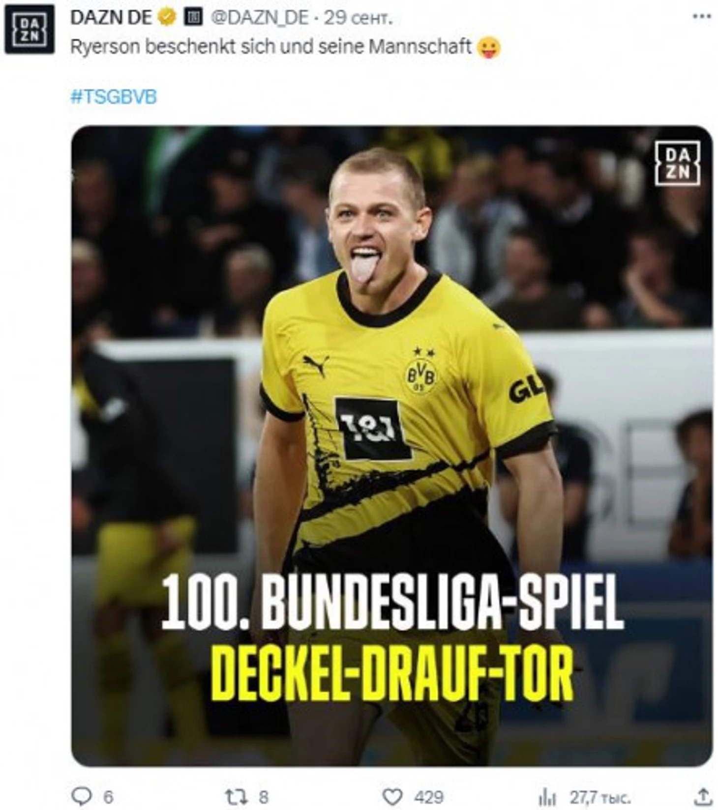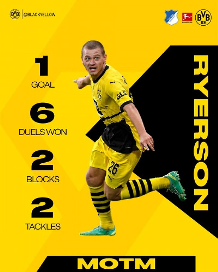 Во втором тайме «Дортмунд» играл пассивно, и было ощущение, что делал все, чтобы сохранить счет до конца матча. Боги футбола, кажется, были против такого исхода: на 71-й минуте вторую желтую получил Бенсебайни, оставив команду Эдина Терзича в меньшинстве. Казалось, что это отличная возможность для «Хоффенхайма» если не выиграть, то хотя бы отыграться. Но вместо этого свой момент использовали гости – и еще как! Уже в самой концовке отличился защитник Юлиан Рюэрсон. Молодой норвежец отобрал мяч в своей зоне, врубил последние скорости и пробежал по левому флангу (и это на 95 минуте!), не заметив защиту «Хоффенхайма», а затем отправил мяч между ног Оливеру Бауманну. Эдин Терзич неоднократно говорил о молодых талантах, которых он будет привлекать к основе, Рюэрсон – как раз один из них. Норвежец еще в прошлом сезоне сыграл за «шмелей» 17 матчей, забив один гол. Сейчас – гол уже за 4 игры, и мало того, что смог отличиться, так еще и принести команде важные три очка.