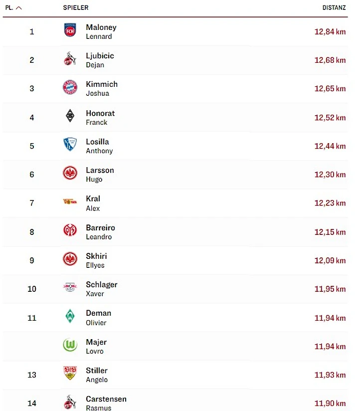 *игрок – кол-во игр – кол-во минут – в среднем км за 90 мин – всего км