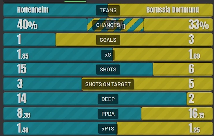 - «Боруссия» выиграла шесть из семи последних встреч в Бундеслиге с «Хоффенхаймом», набрав 19 очков из 21 возможного - их лучший результат среди всех команд, с которыми они встречались за последние три сезона.