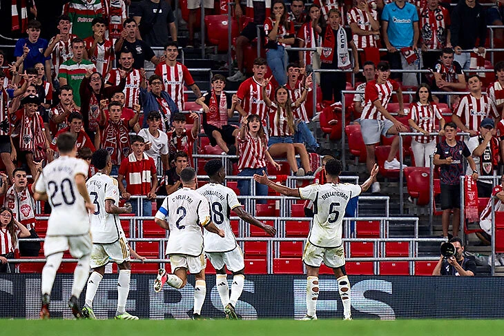 Беллингем празднует с расставленными руками везде. Например, в Бильбао, забив «Атлетику», он встал в такой позе перед трибуной противника.