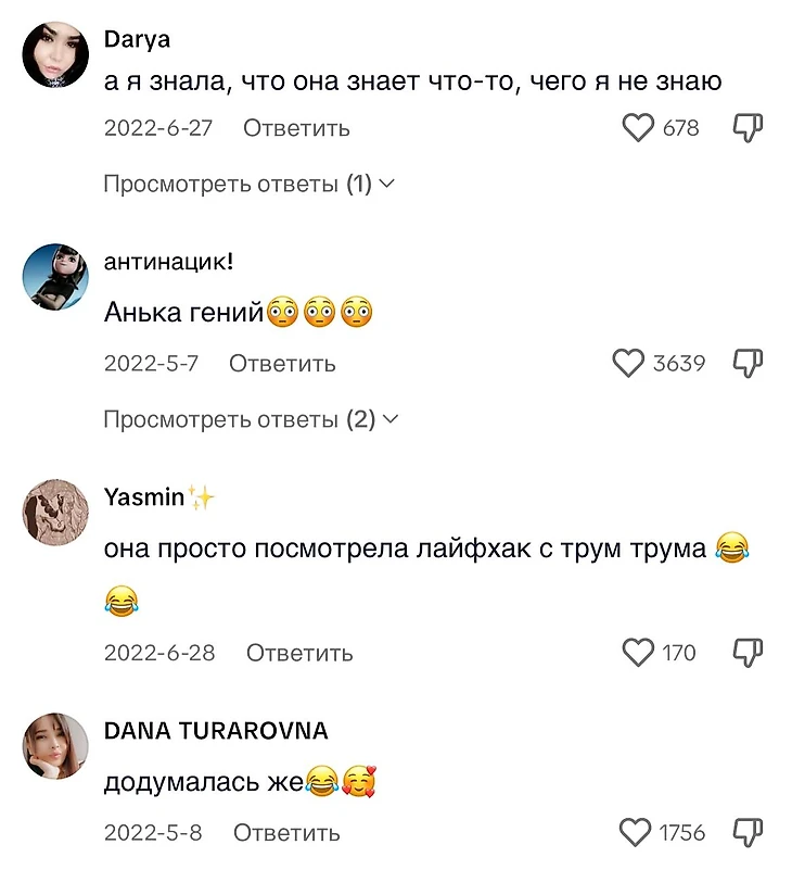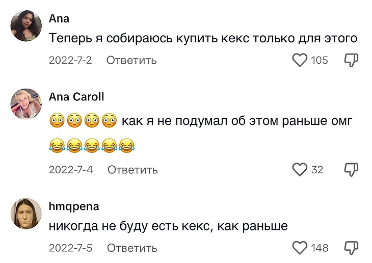 Небольшой TikTok-аккаунт с лайфхаками (в среднем до 5 тысяч просмотров под видео) словил невероятный куш – 14,7 млн просмотров и 2 млн лайков под видео, где Энн Хэтэуэй учит зрителей, как правильно кушать капкейки. Отлично подойдет для любой леди и всех тех, кто не любит вымазывать губы в обильный крем. Лучше один раз увидеть, чем сто раз услышать: