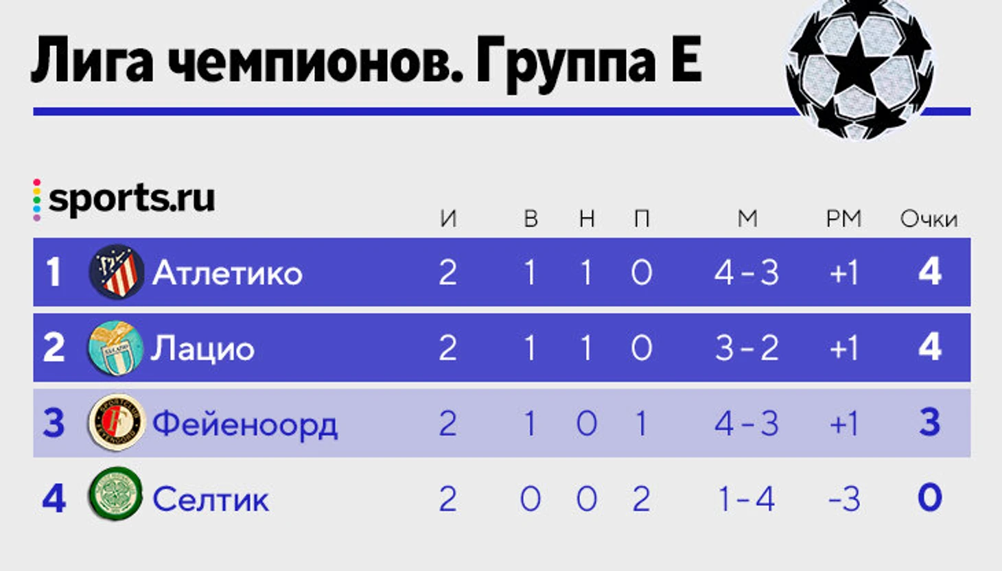 Они последние в группе. «Лацио» и «Атлетико» после той Проведель-ничьей синхронно выиграли и обошли «Фейеноорд».