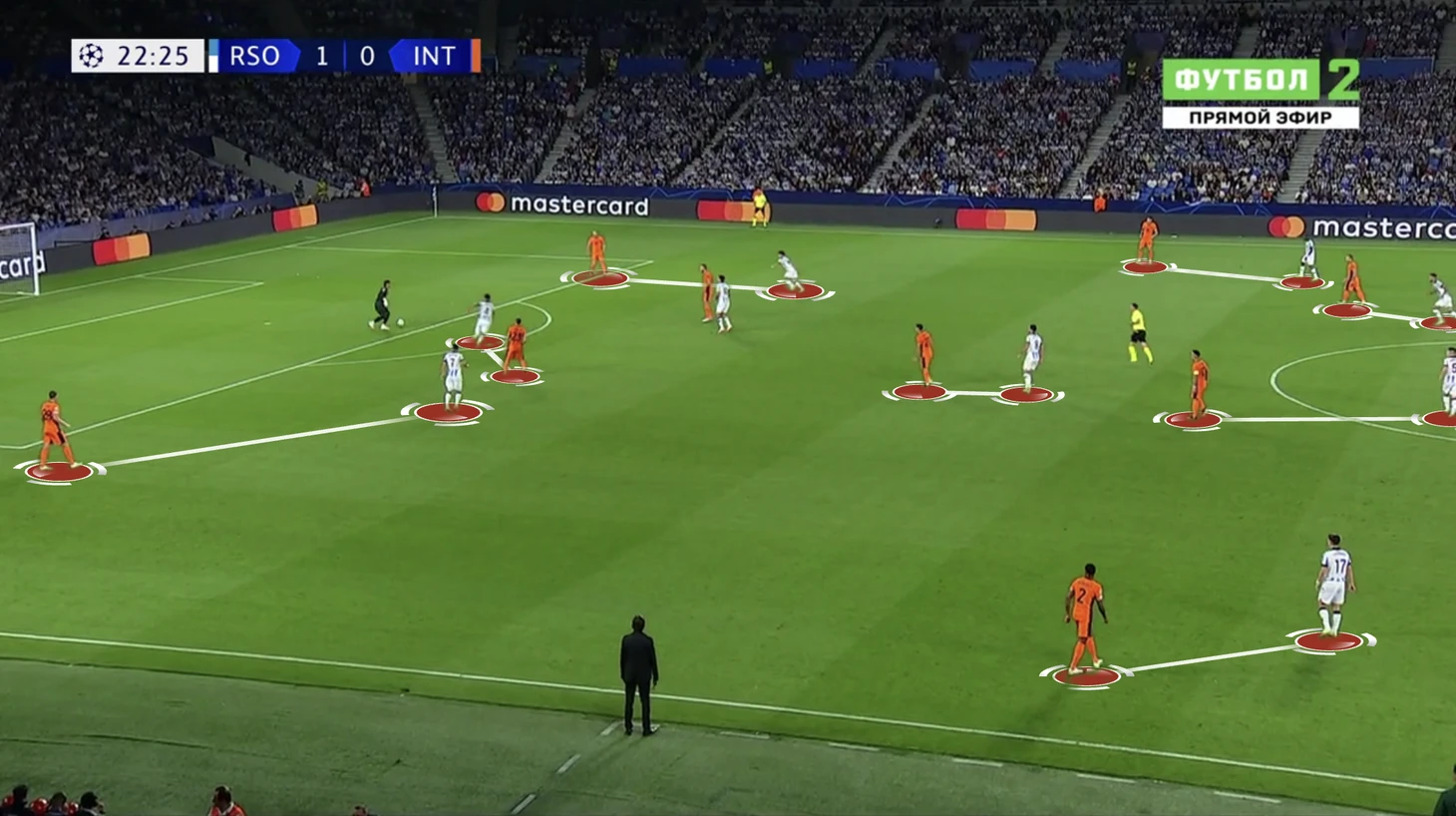 Такие классные первые таймы – залог классной домашней подготовки тренера. Базисом к доминированию «Сосьедада» выступает прессинг. Его Альгуасиль здорово крутит под соперника. Против «Интера» прессинг был практически персональным и нейтрализовывал хитрую гибкую структуру, которую использует Симоне Индзаги: