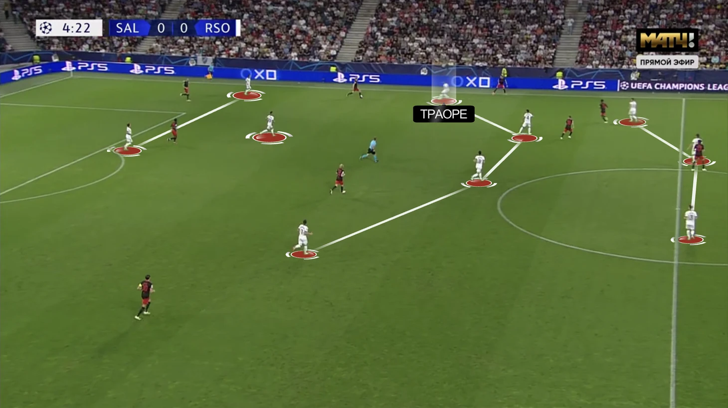Против «Зальцбурга» состав не поменялся, но теперь прессинг был ориентирован на зоны. Основной расстановкой стали 3-4-1-2. Правый защитник Амари Траоре регулярно поднимался в полузащиту. Снова тотальный контроль: