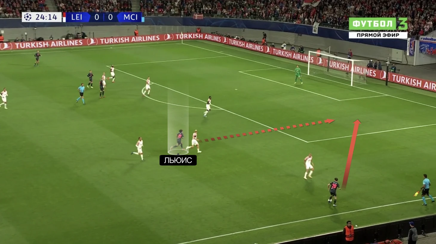 Рывки Льюиса были особенно хороши в первом тайме. Тут за счет открывания освобождает Бернарду Силву: