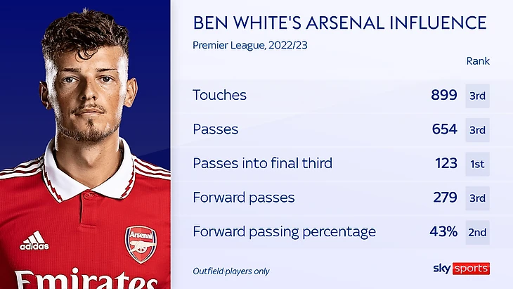 Летом 2022 года в расположение «Арсенала» вернулся Уильям Салиба, ставший в сезоне 21/22 лучшим молодым игроком Лиги 1. Уильям Салиба стал наигрываться на позиции правого центрального защитника, а Бена Уайта Микель Артета стал пробовать на позиции правого защитника. Эксперимент оказался удачным: англичанин на позиции выглядел лучше Такехиро Томиясу и Седрика Соареша, а быстрая скорость и умение начинать атаки очень помогли Бену адаптироваться на позиции и стать одним из лучших правых защитников лиги. Уайт стал одним из лучших правых защитников Премьер-лиги по среднему рейтингу за матч, созданным голевым моментам (6), точности передач за игру (87%), и ключевым пасам за игру (0.7). Более того, игрок прокачал и атакующие навыки. В сезоне 22/23 он забил 2 гола и отдал 5 ассистов.