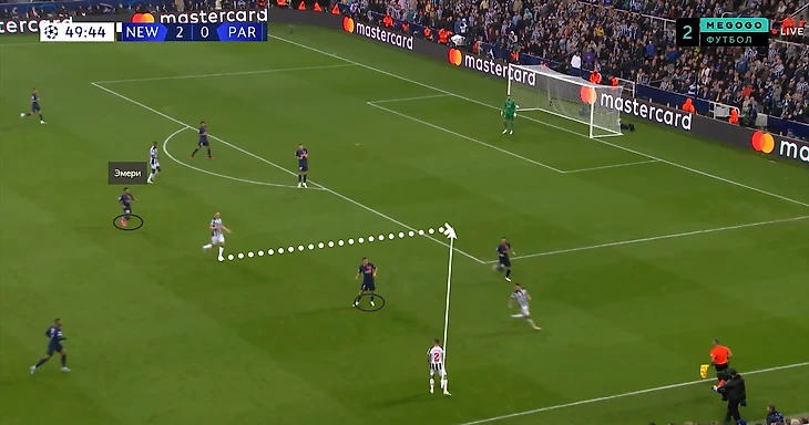 Маркиньос с мячом. Иска контролирует вратаря и не дает сделать перевод мяча на другой фланг. Реджала сместился в центр, если пойдет перевод то успеет накрыть левого ЦЗ или центрального полузащитника. При длинной передаче на левого защитника игроки «Ньюкасла» успеют перестроиться.
