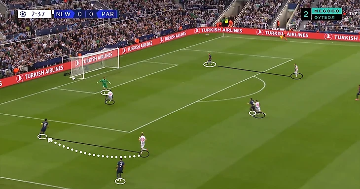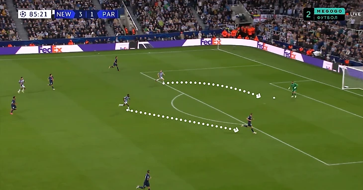 «Ньюкасл» плотно играл в центре, крайние нападающие садились в линию полузащиты. Схема преобразовывалась в 4-5-1. При выдергивании игрока, сразу сужали, чтобы не проходили передачи между линиями. Заставляли игроков ПСЖ атаковать флангом.