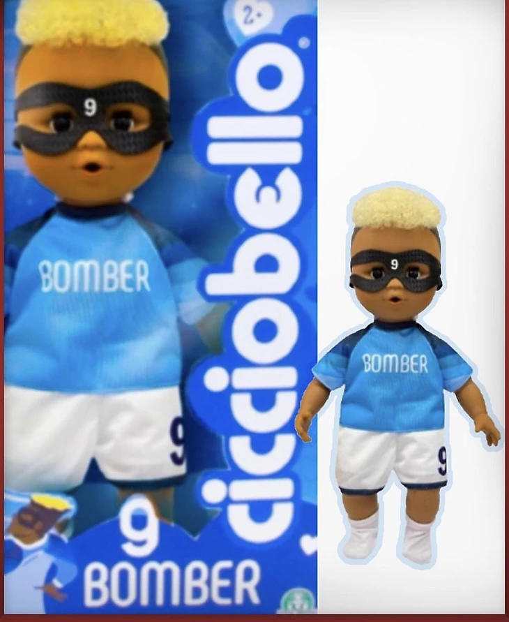 В кукле угадываются черты Виктора Осимхена, от светлых волос до маски на лице, а также девятый номер на шортах и комплект формы «Наполи», который использовался в прошлом сезоне. В магазины игрушка должна была поступить в ближайшие недели, однако вмешался неаполитанский клуб.