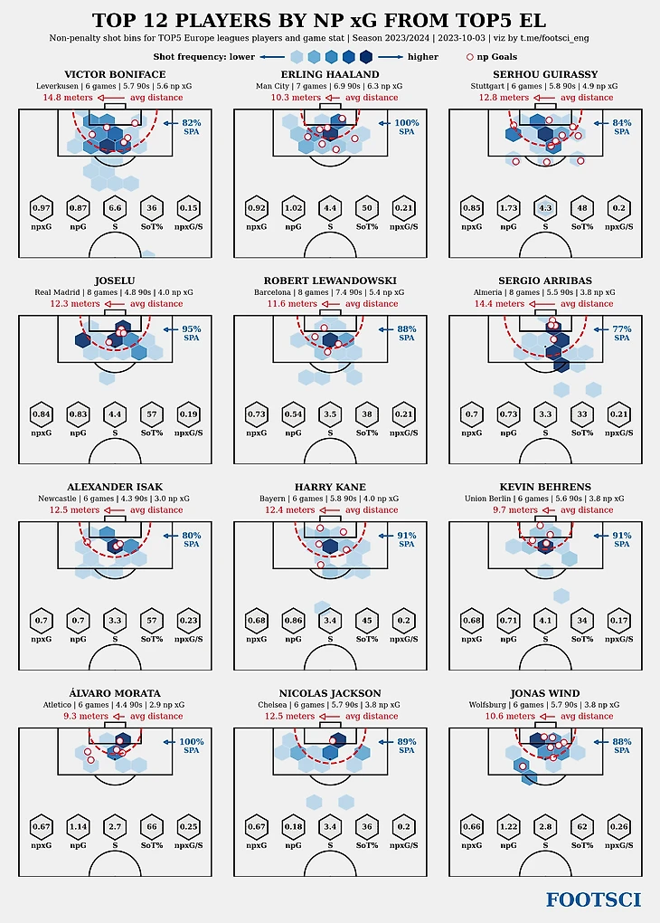 Лидер рейтинга - Виктор Бонифасе. 38 ударов за почти полных 6 игр и 6.6 ударов за игру. Лучший бомбардир Байера с 6 голами (5 + 1) и на 4 месте в Бундеслиге. Из пределов штрафной нигериец наносит 82% ударов. В среднем за игру зарабатывает почти 1 ожидаемый гол и забивает почти 0.9 гола. Средняя опасность каждого удара составляет 0.15 npxG.