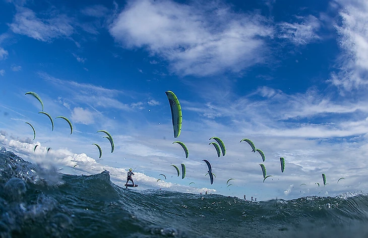 22 сентября. Ярко-салатовый чемпионат Европы по кайтингу на фоне синих оттенков моря и неба.