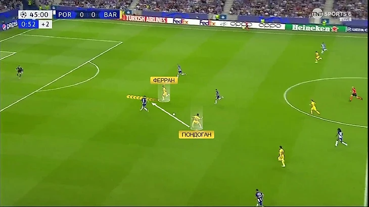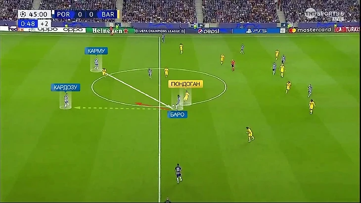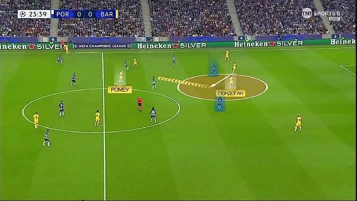 «Барса» часто использовала переводы, но это не приводило к большой опасности – «Порту» дисциплинированно садился в позиционную оборону. А вот ситуации 5-в-4 в последней линии уже выглядели перспективнее. Вот пример – здесь здорово сыграл Гюндоган, опустившись на позицию опорника (обратите внимание на расположение Ромеу), он здорово прошёл с мячом и продвинул его в последнюю линию, где как раз образовалась ситуация 5-в-4: