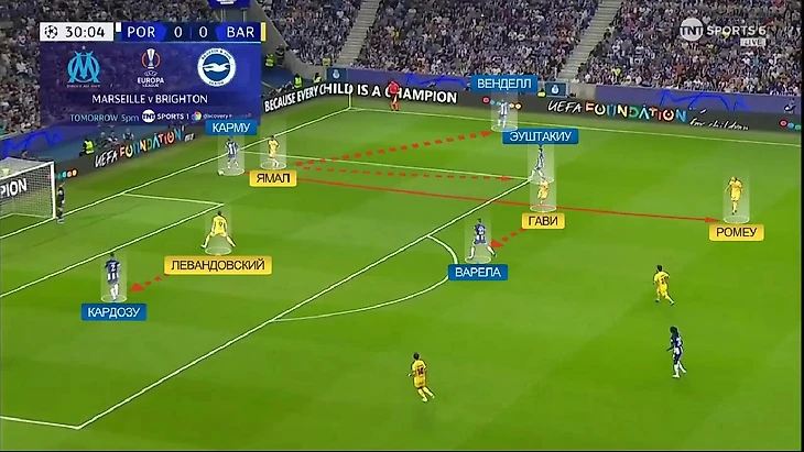 Но гости здорово среагировали на этот перевод (по многом из-за того, что его качество было не самым лучшим) и продолжили прессинговать. По сути Карму оказался в ловушке – Ямал перекрывает ему линию на Венделла и Эуштакиу, а Левандовский на Кардозу. Остаётся вариант с Варелой, но на него уже переключается Гави. Видимо из-за этого Карму решил рискнуть и исполнить пас на Эуштакиу, но в итоге мяч прилетел к Ромеу: