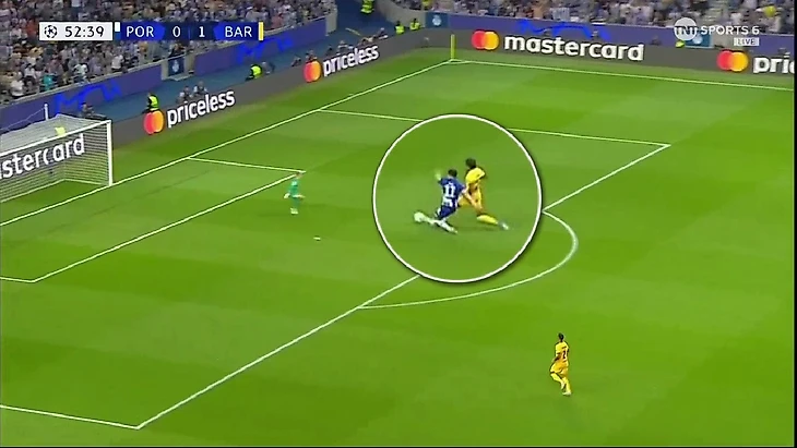 Чистейший выход 1-на-1 и от неминуемого гола спас фантастический подкат Жюля Кунде в самый последний момент: