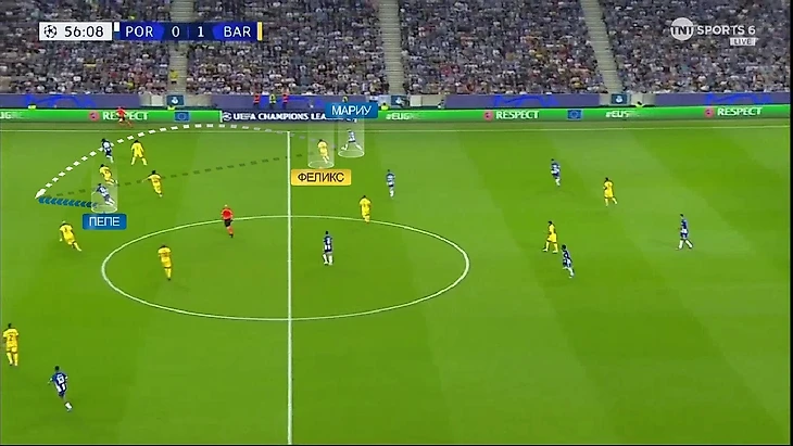 Другой, также не красящий прессинг «Барсы» момент – Жоау Феликс не накрывает активно Жоау Мариу, поэтому тот без труда делает заброс на Пепе́. Классика – высокая линия без прессинга. Очередь Араухо спасать.
