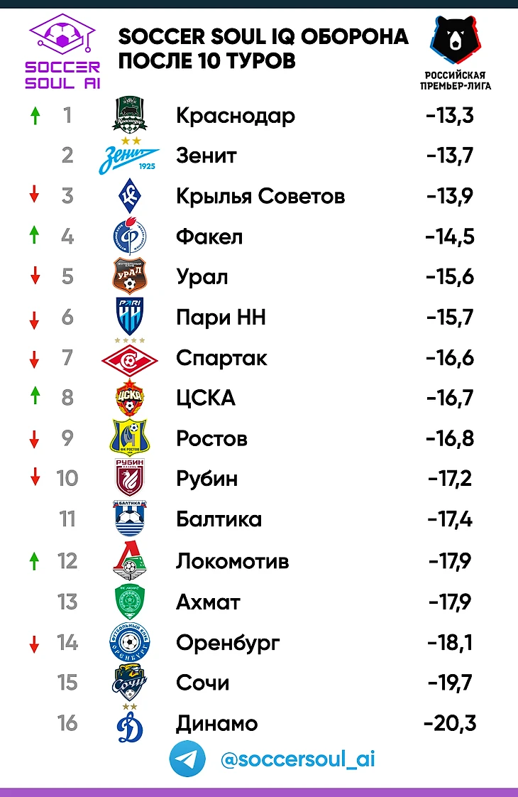 Soccer Soul IQ (оборона) — баллы, которые команда позволяет набрать сопернику на этапах продвижения мяча через АВП и завершения атак.(минусовое значение Soccer Soul IQ соперника)