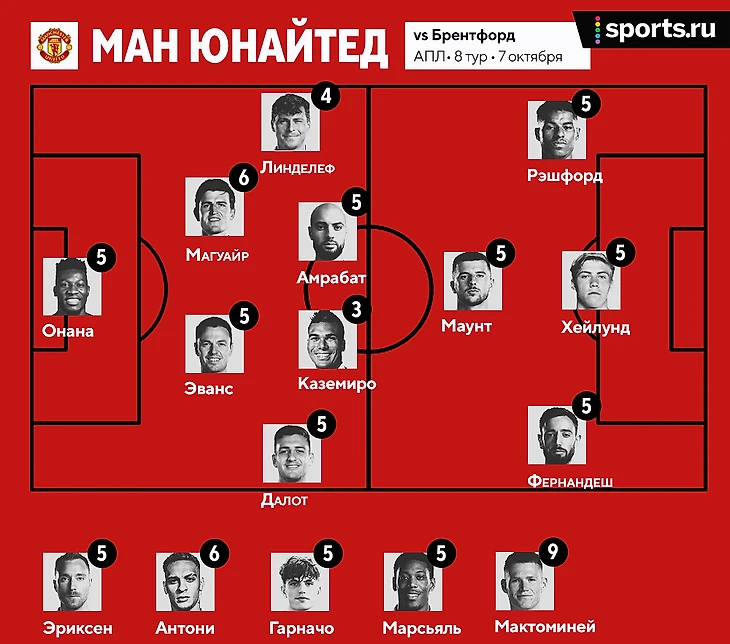 Бруну Фернандеш (5). Сделал лишь две острые передачи – отчасти заслуга плотной обороны «Брентфорда». К сожалению, очередная безрезультативная игра португальца.