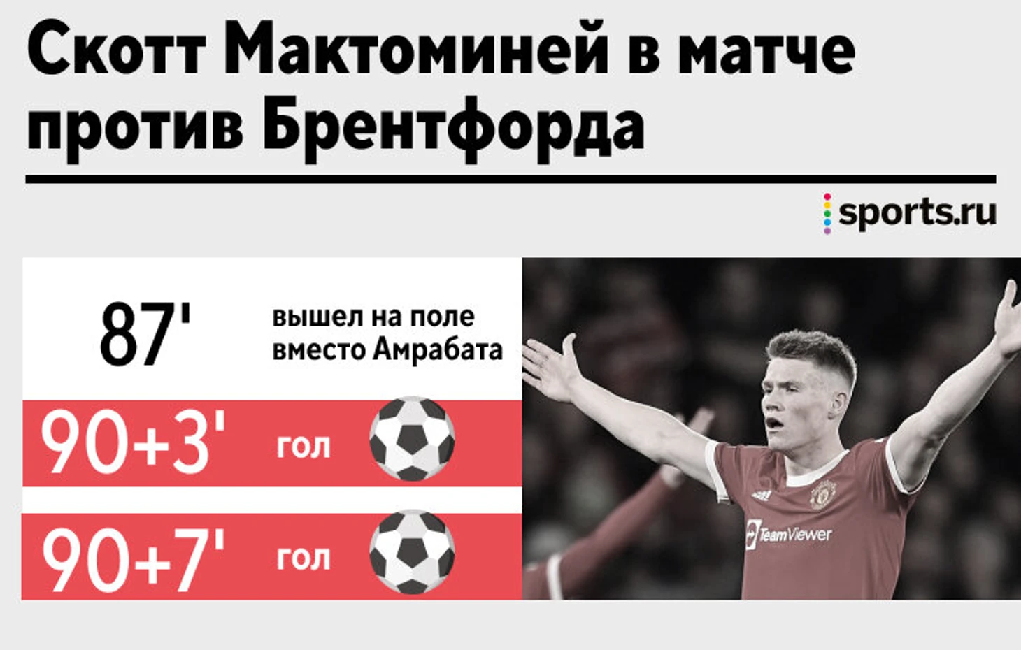 Дубль в ворота «Брентфорда» стал для Мактоминея четвертым в карьере – два в клубе и два в сборной. Он выстрелил в матче с «Лидсом» (6:2) в 2020-м, а также в текущем розыгрыше квалификации Евро: забил Испании (победные мячи) и Кипру.