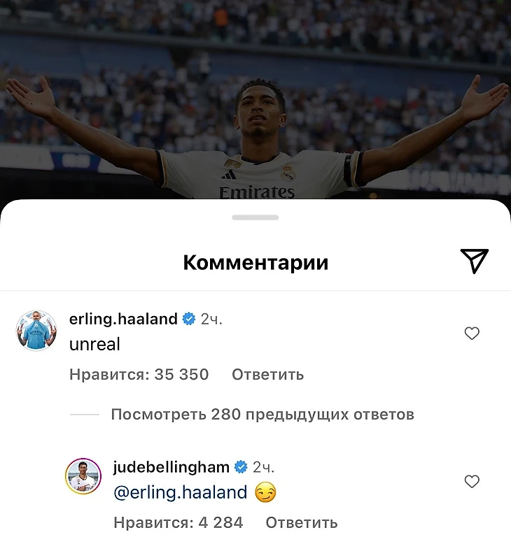 В комментарии к Джуду пришел Холанд. Экс-партнер англичанина по дортмундской «Боруссии» написал всего одно слово: «Невероятно». Беллингем ответил Эрлингу улыбающимся эмодзи.