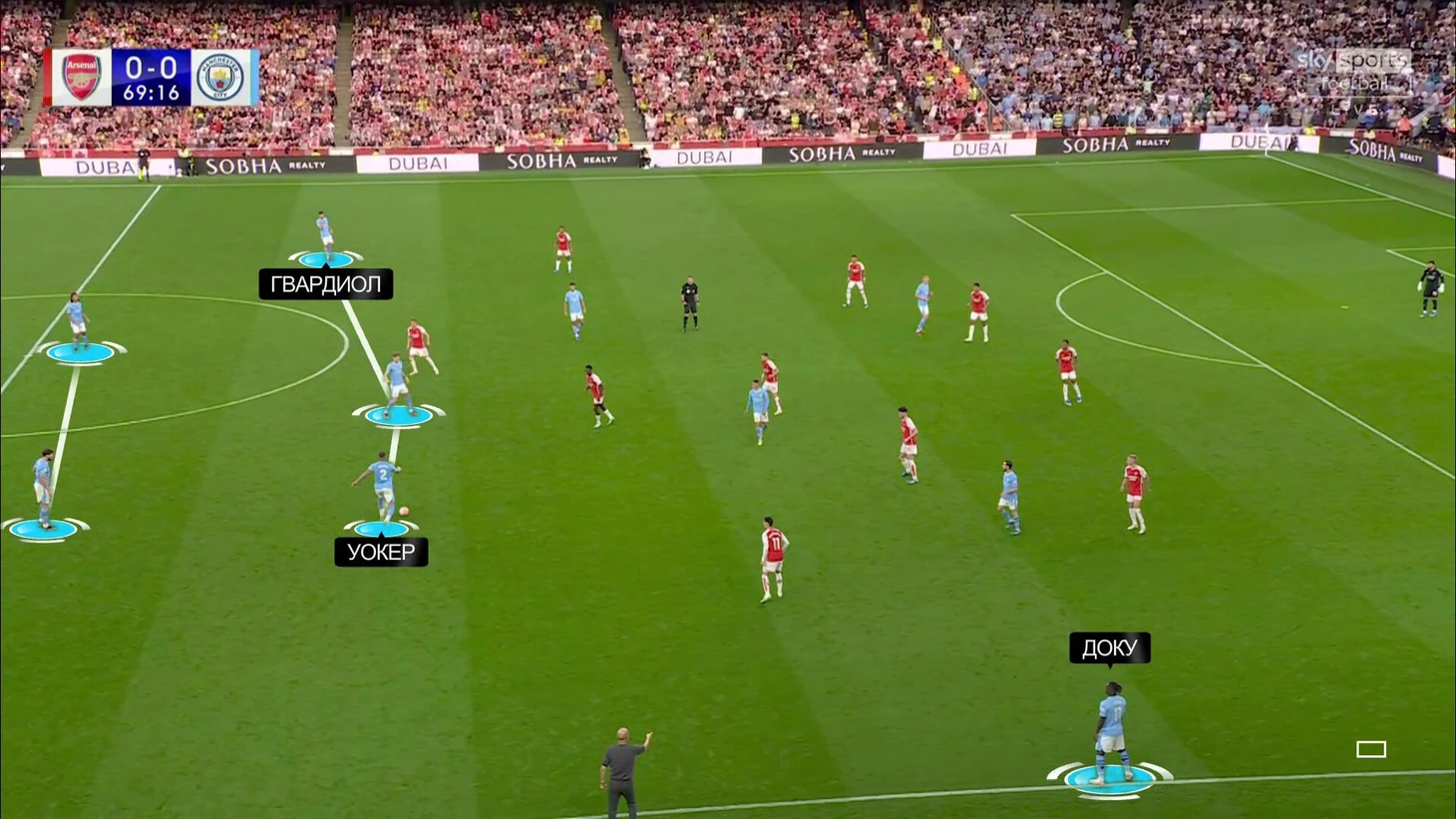 Порция замен от Пепа на 68-й минуте казалась попыткой вернуть более привычные для «Сити» механизмы и раскрыть игру. Спойлер: не получилось (у «Сити» после 58-й ни одного удара). Но намерение было: Джон Стоунз взял роль Родри, а в лице Жереми Доку появился акцентированный вингер. Изначально Доку расположился справа и действовал против Зинченко, но еще до замены Александра ушел на левый фланг, предварительно два раза потеряв мяч в прямых дуэлях.