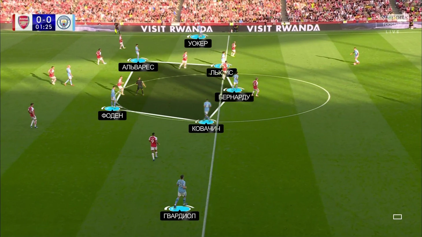 Намерения Пепа предполагали повышенный контроль, даже если в жертву приносились обострения и традиционная структура. Игроки центра в условиях численного перевеса держали мяч, но не получали пространства в чужой опорной, так как «Арсеналу» не нужно было растягиваться.