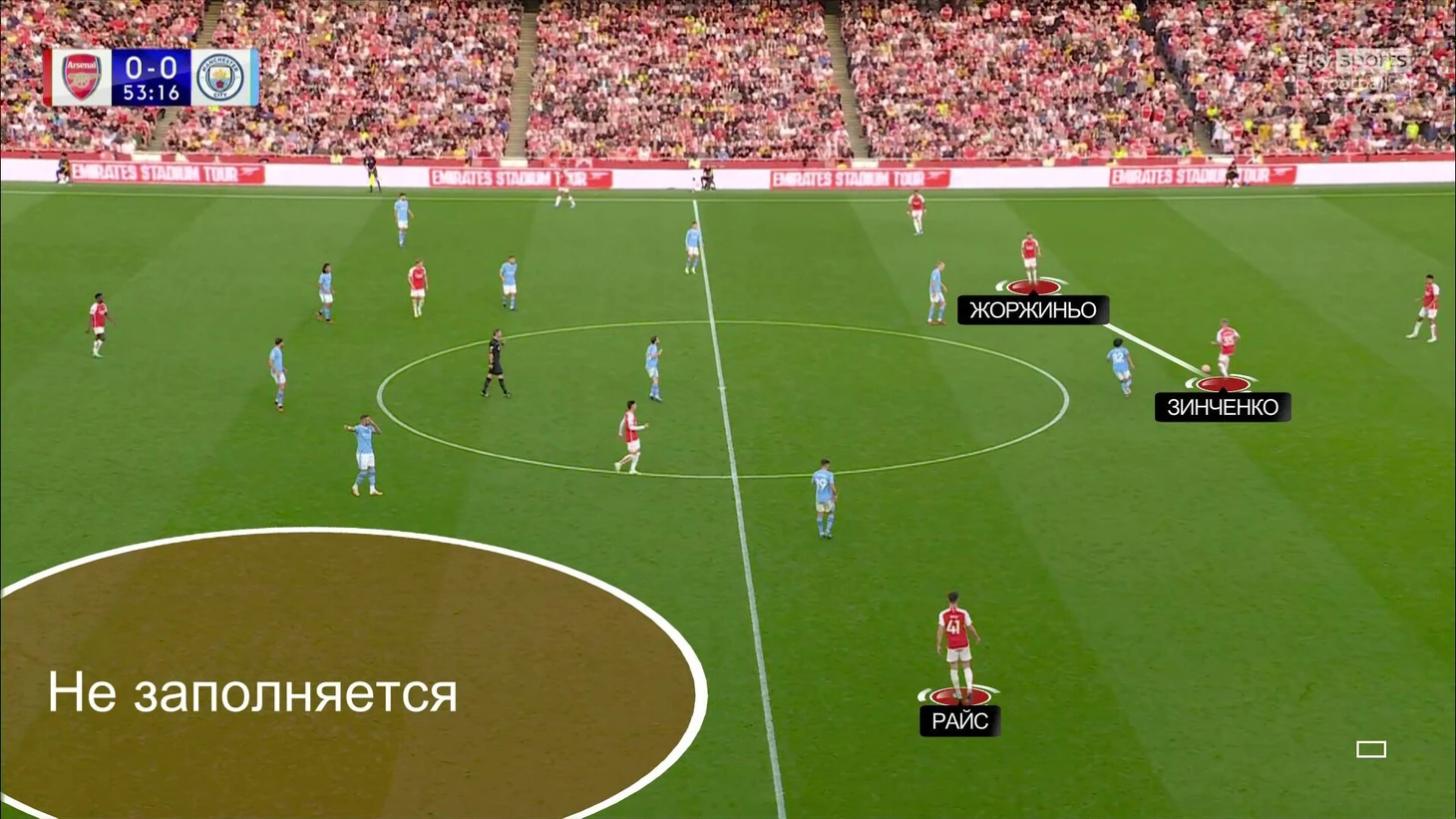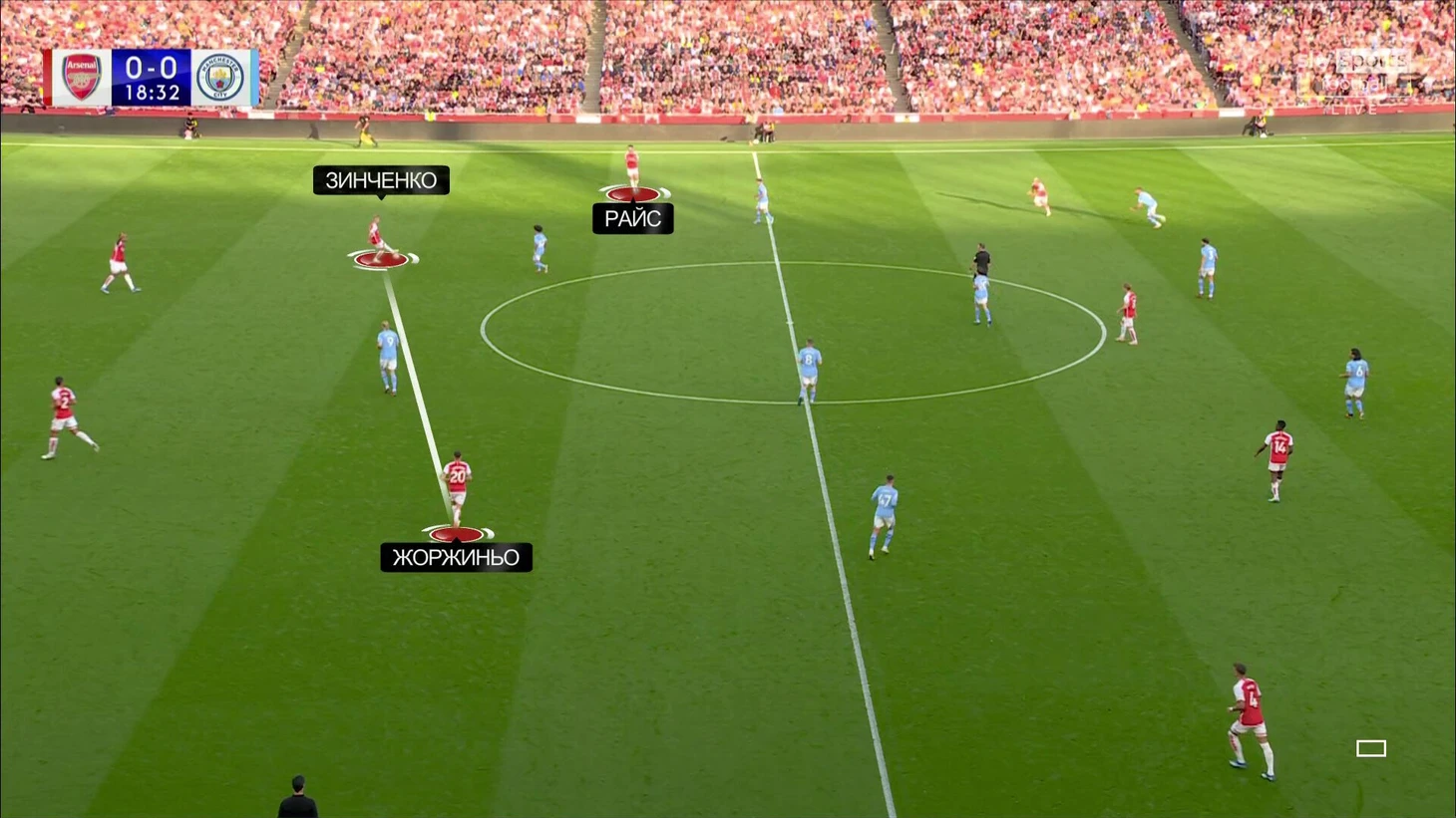 Адаптация под «Сити» – это более осторожное наполнение состава в центре. Как и в Суперкубке, Деклан Райс стартовал рядом с основным опорником: тогда – Томас Парти; сейчас – Жоржиньо. По позиции англичанин занял место, которое обычно достается Каю Хавертцу. На практике он иначе трактует эту роль. Без мяча цементирует центр, но с мячом получается более осторожная структура.