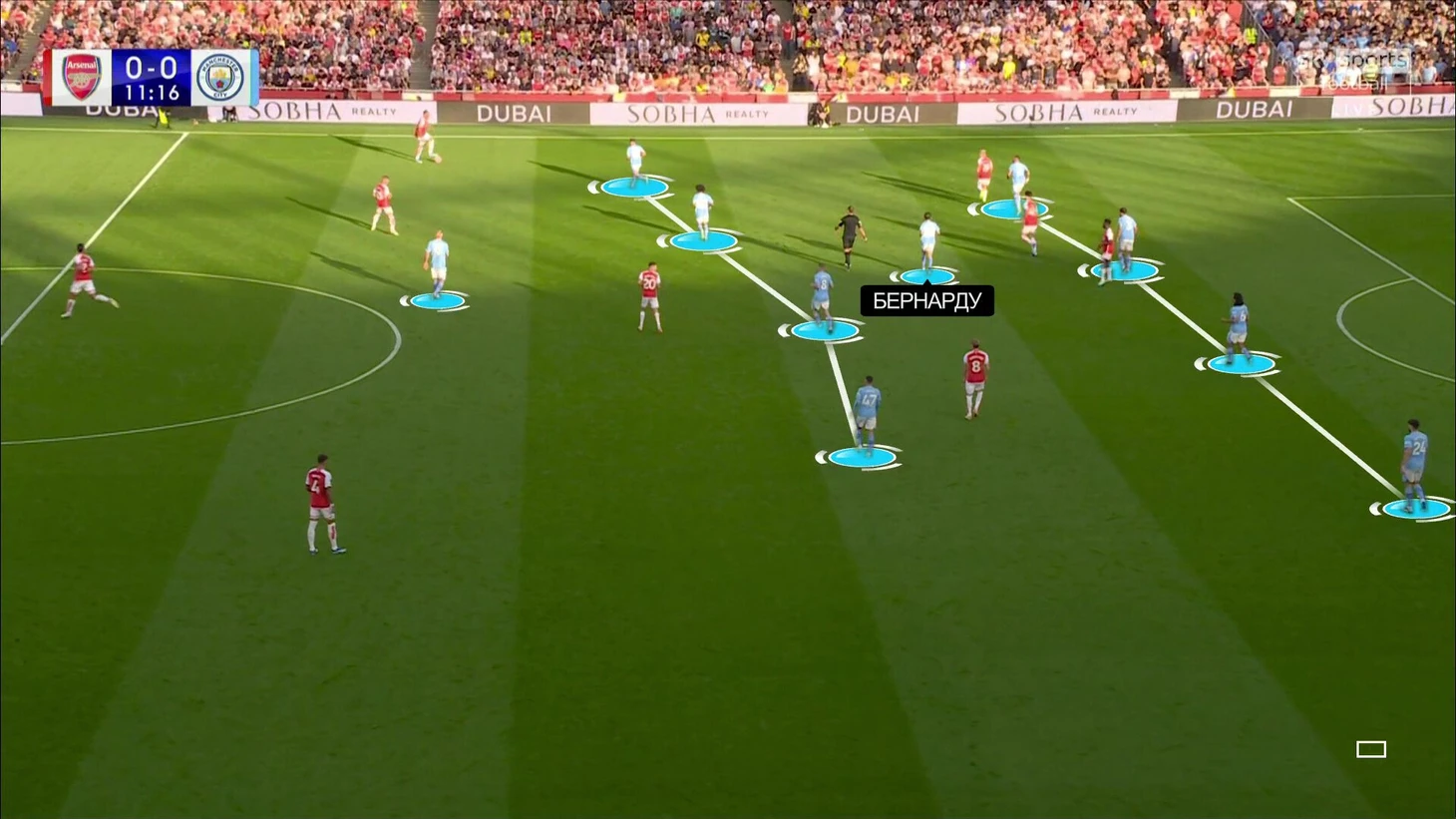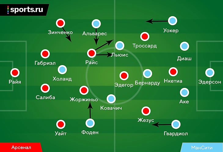 «Сити» попытался заменить Родри переводом в опорную Бернарду Силвы. Но на практике изменилась вся структура владения (подробнее ниже). «Арсенал» использовал Габриэла Жезуса на месте Сака – бразилец хорош, но не дает такой же вариативности на этой позиции.
