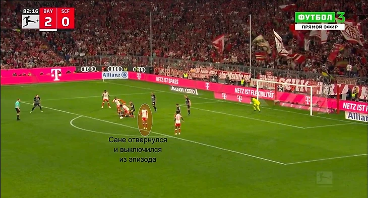 Самый эпичный момент – пас Сане пяткой под удар Горетцки. Быстрая атака «Баварии» вроде бы захлебнулась – так думал сам Сане, который не смог на рывке зайти в штрафную. И вместо того, чтобы дальше бороться за мяч, он выключился из эпизода и показательно отвернулся…