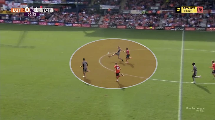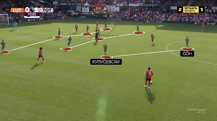Во-вторых, смелые подключения крайних защитников. Даже в меньшинстве шли вперед. «Лутон» мог наказывать. Вот тут образовалась ситуация 2-в-2. Центральные защитники «шпор» без подстраховки. Скорее напоминаем поведение команды, которой нужно отыгрываться, а не той, что ведет в счете, играя в меньшинстве: