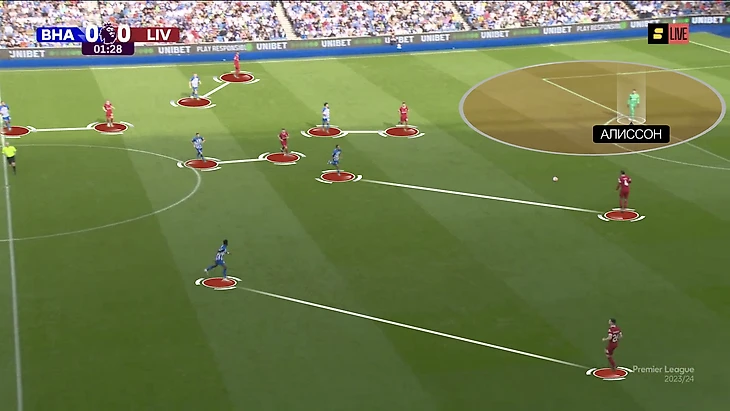 Де Дзерби устроил персональную охоту, в которой у каждого игрока «Брайтона» был прямой оппонент. Свободным у «Ливерпуля» оставался только Алиссон: