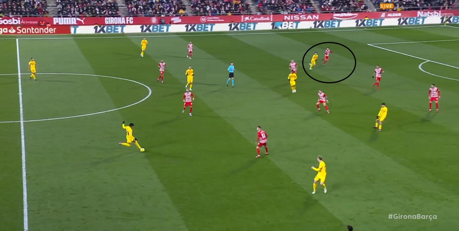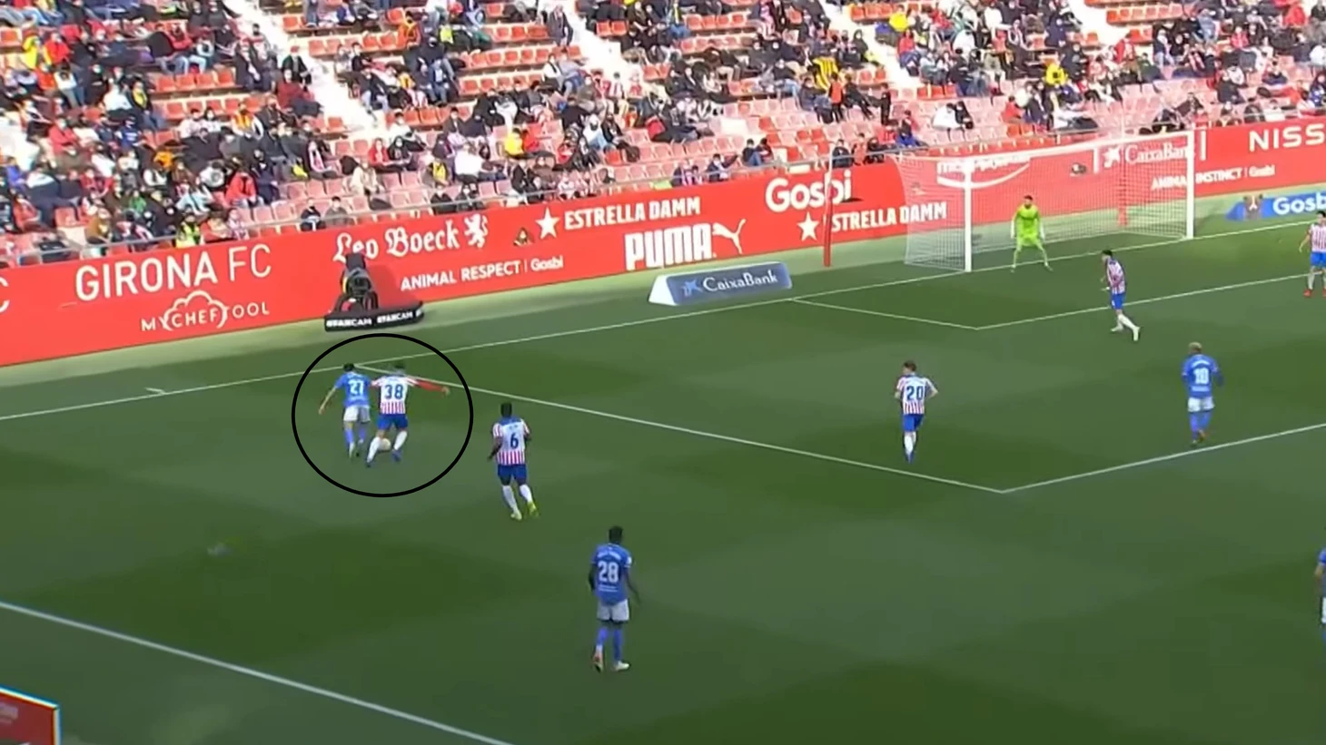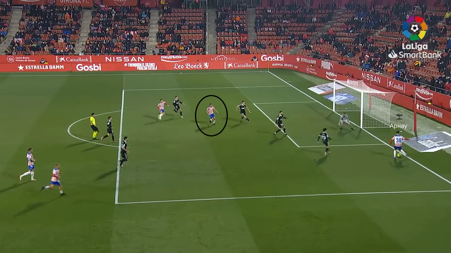 Арнау образцово действует, встречая оппонента в высокой позиции. Он вовремя выдвигается, и когда тот принимает мяч, Мартинес оказывается от него на расстоянии шага. Защитник направляет соперника во фланг, а при попытке уйти на смещении в центр успевает достать мяч левой ногой.