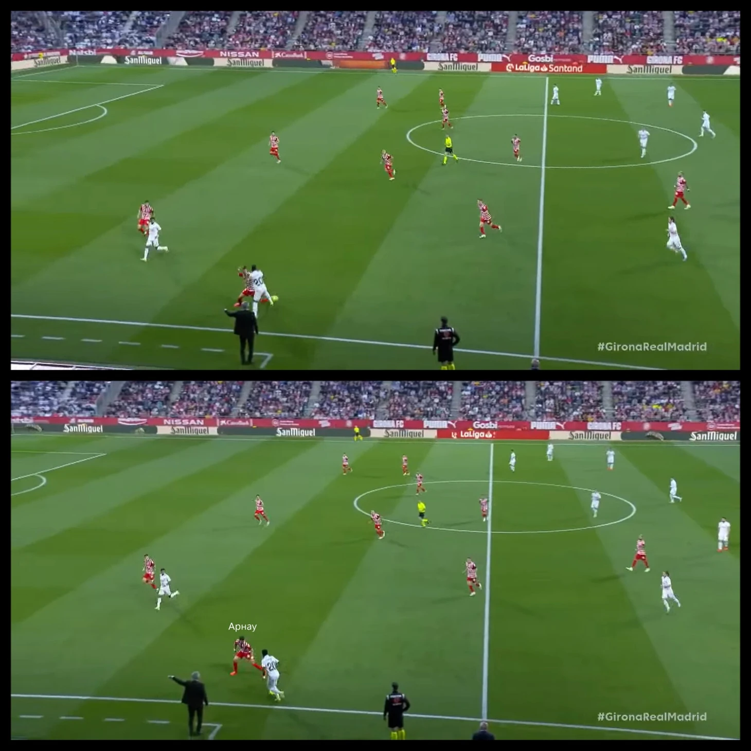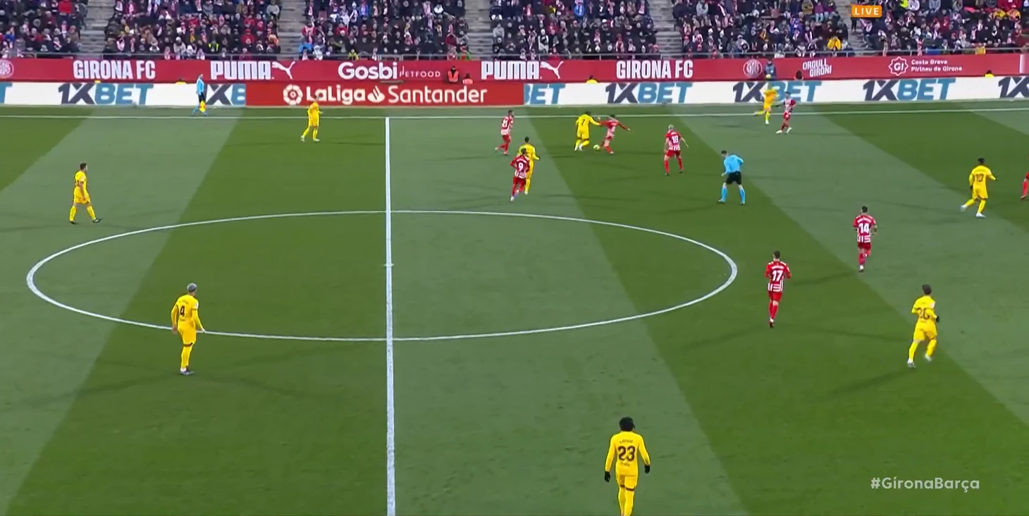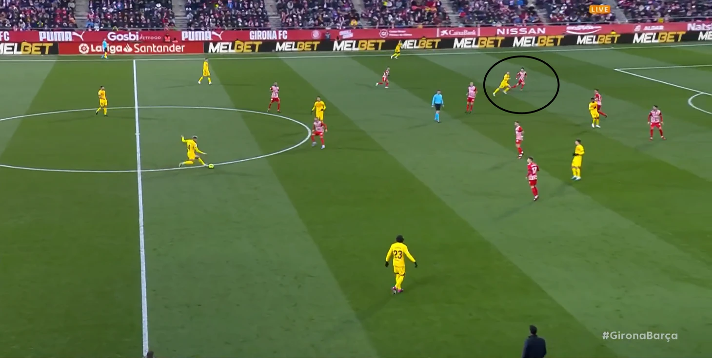 Арнау образцово действует, встречая оппонента в высокой позиции. Он вовремя выдвигается, и когда тот принимает мяч, Мартинес оказывается от него на расстоянии шага. Защитник направляет соперника во фланг, а при попытке уйти на смещении в центр успевает достать мяч левой ногой.