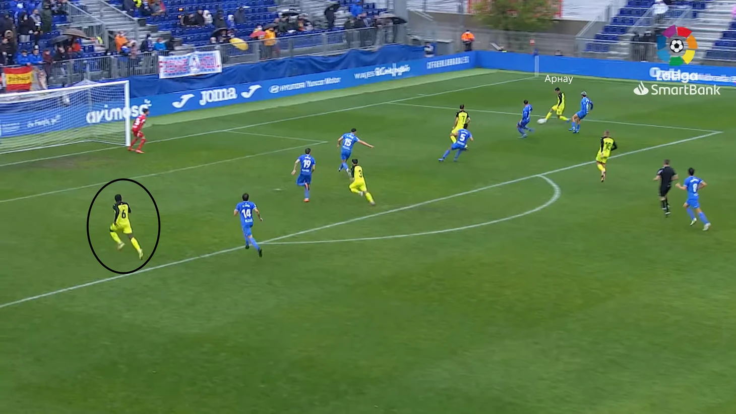 В ситуациях с открытым мячом Арнау вовремя начинает движение к своим воротам, стартуя одновременно с соперником. Это вкупе с небольшим зазором позволяет ему первым оказываться на мяче.
