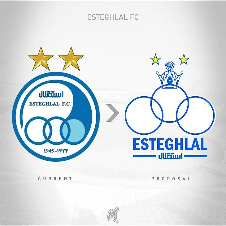 Эстегляль. Действующий логотип хорошо подходит под современные тренды футбольной геральдики. Из минусов можно выделить только лишь звезды, которые немного не сочетаются с гербом. На дизайне очень сильно детализирована корона, а текст вышел за предела щита. Идея неплохая, но нуждается в некоторых изменениях.
