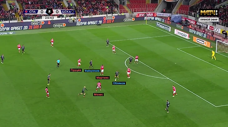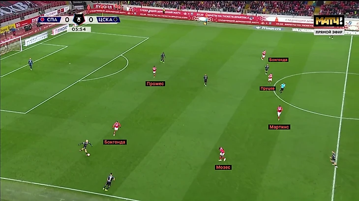Бонгонда был именно левым нападающим не просто так – при атаке «Спартак» перестраивался на 4-3-3. Мозес и Пруцев становились двумя восьмёрками над Мартинсом, Бонгонда и Медина играли на флангах, а Промес оставался в центре нападения.