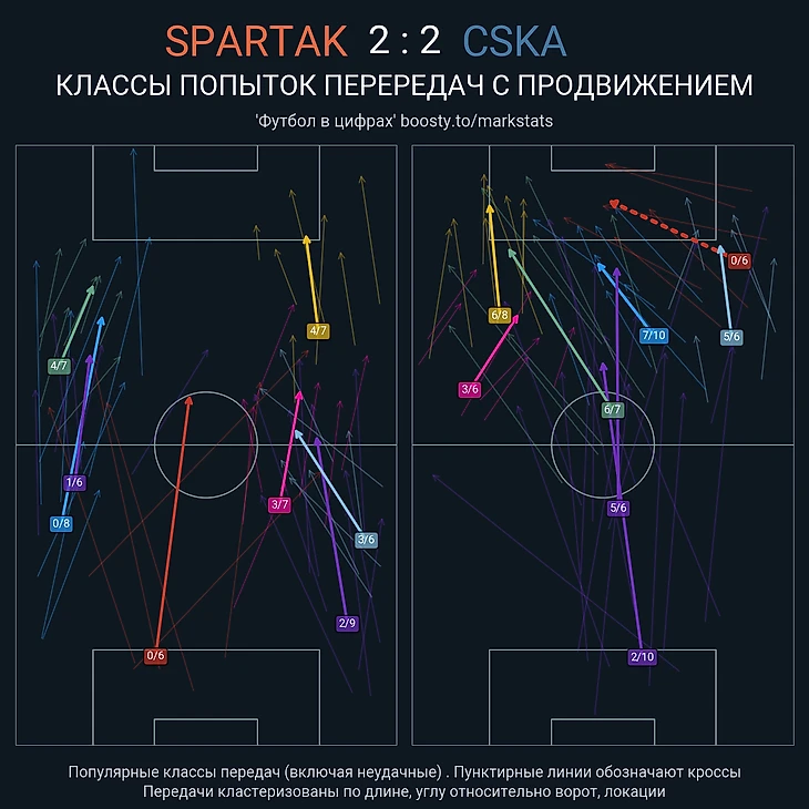 По карте передач с продвижением видно, что игроки ЦСКА получали мяч между линиями по всей ширине поля и обостряли оттуда больше всего.