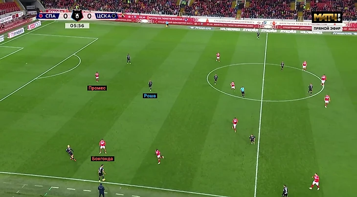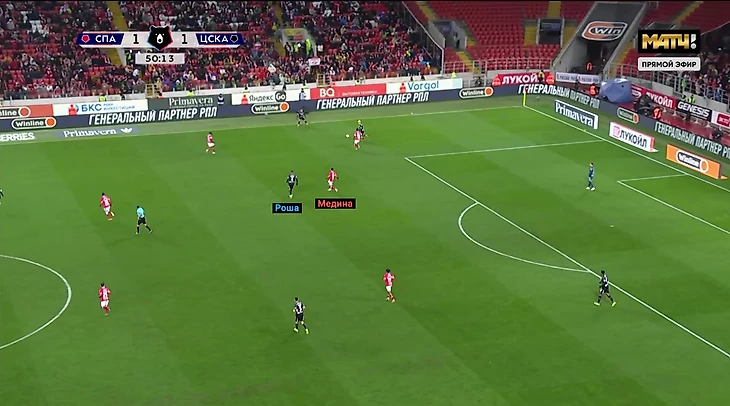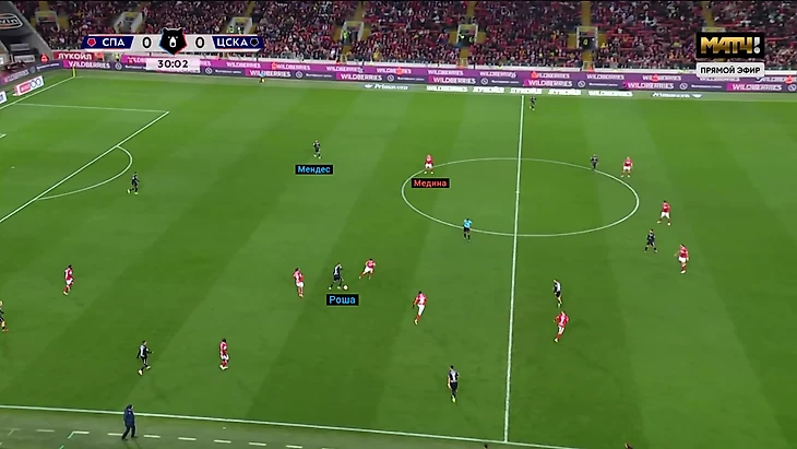После перерыва у «Спартака» Медина и Бонгонда поменялись местами. Теперь Тео играл справа в 4-4-2, а при атаке Промес уходил на левый фланг, а Медина оставался в центре нападения. Хесус внимательнее следил за смещениями Роши.